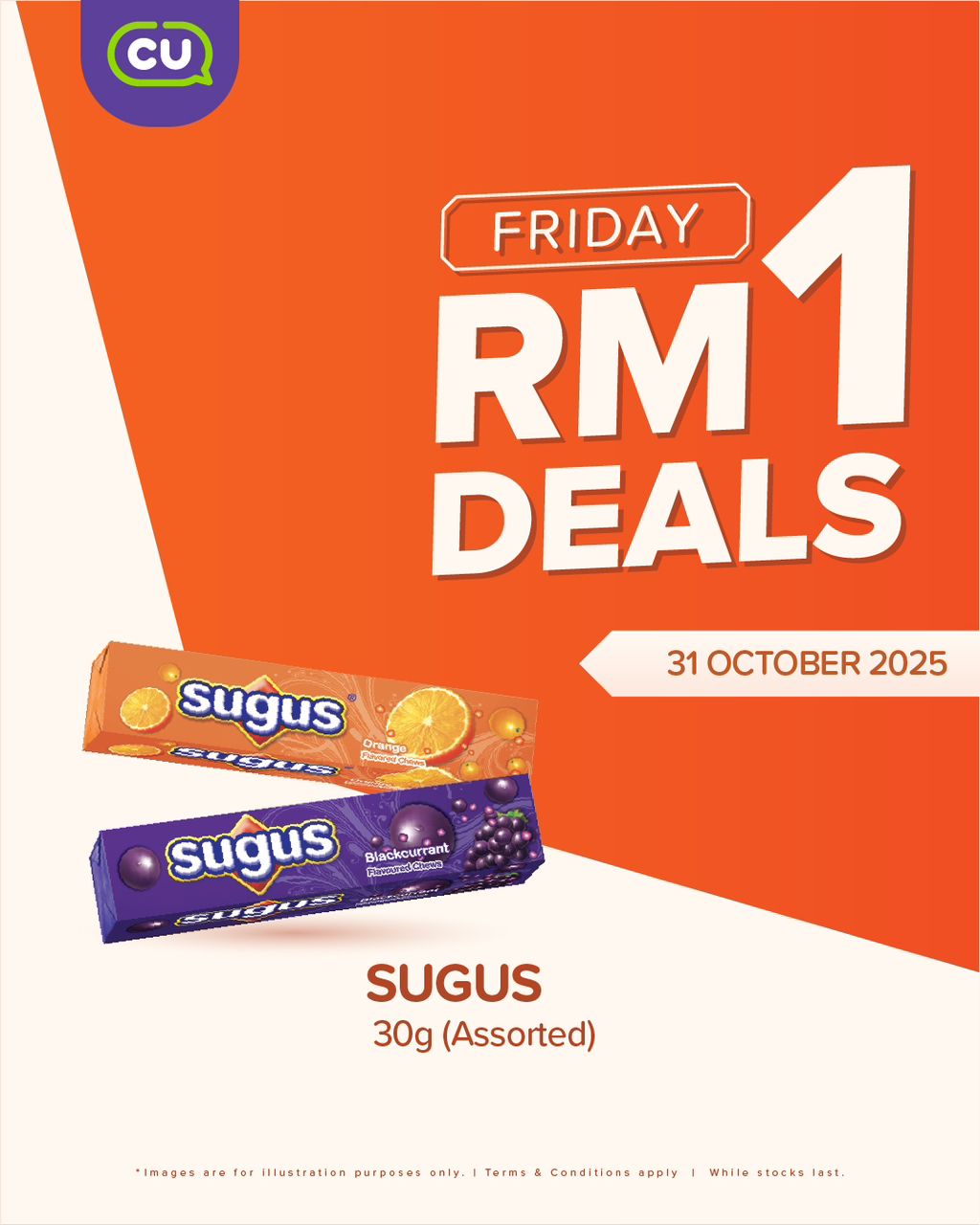 FRIDAY RM1 DEALS – CUCentrePoint_admin2025-10-02T16:06:11+08:00FRIDAY RM1 DEALS – CU 🍬 FRIDAY RM1 DEALS! 🍬 Get your favorite SUGUS (30g, assorted flavors) for only RM1 each ‼️🍊 Orange | 🍇 Blackcurrant 📅 Valid on 31 October 2025📍 Available at CU – Centrepoint | ⏳ While stocks last Date : 31st October 2025 – while stocks last! Location : Store Directory »