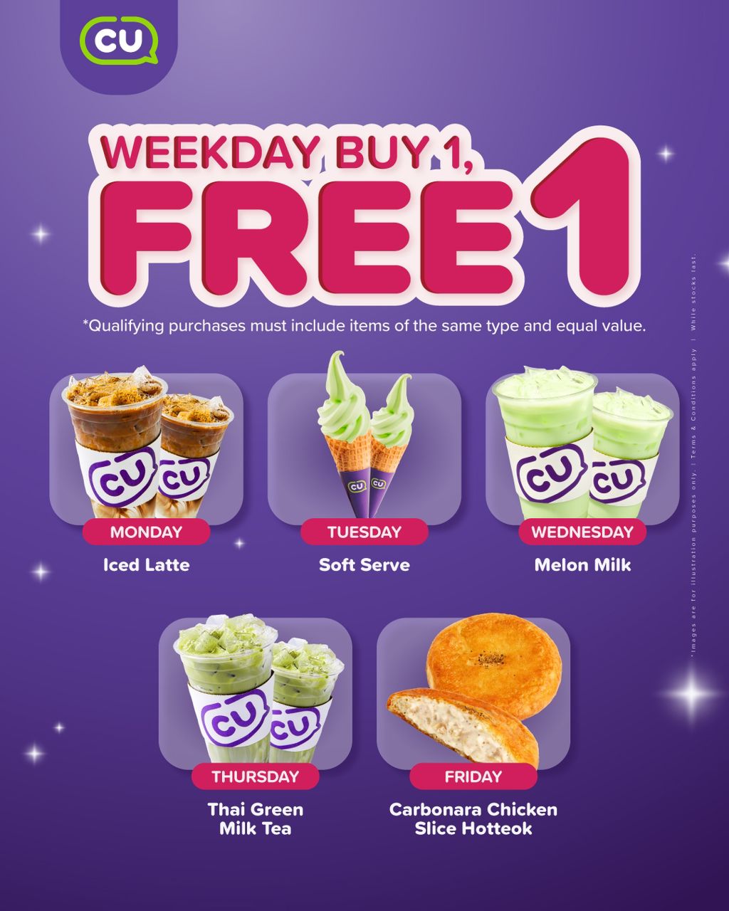 WEEKDAY BUY 1, FREE 1 – CUCentrePoint_admin2025-10-02T16:29:56+08:00WEEKDAY BUY 1, FREE 1 – CU ✨ Double the Treats, Double the Joy ✨ Indulge in our Buy 1 Free 1 offer — because one is never enough. Available now at CU stores. 💚 Date : 1st – 31st October 2025 – while stocks last! Location : Store Directory »